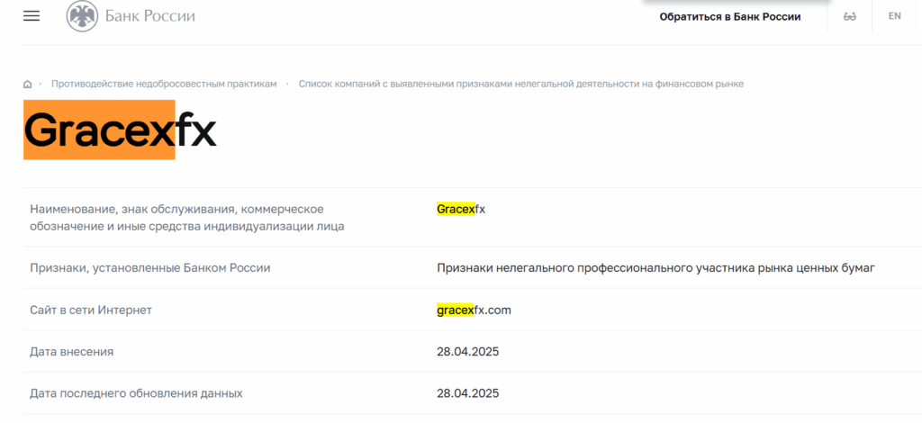 Результат оказался ожидаемым, но от этого не менее печальным: брокер GRACEX отсутствует в реестре ЦБ РФ. Это означает, что компания не имеет права оказывать брокерские услуги на территории Российской Федерации.