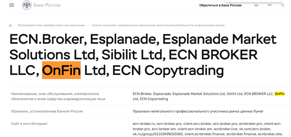 Центробанк РФ предупреждает: OnFin — нелицензированный брокер